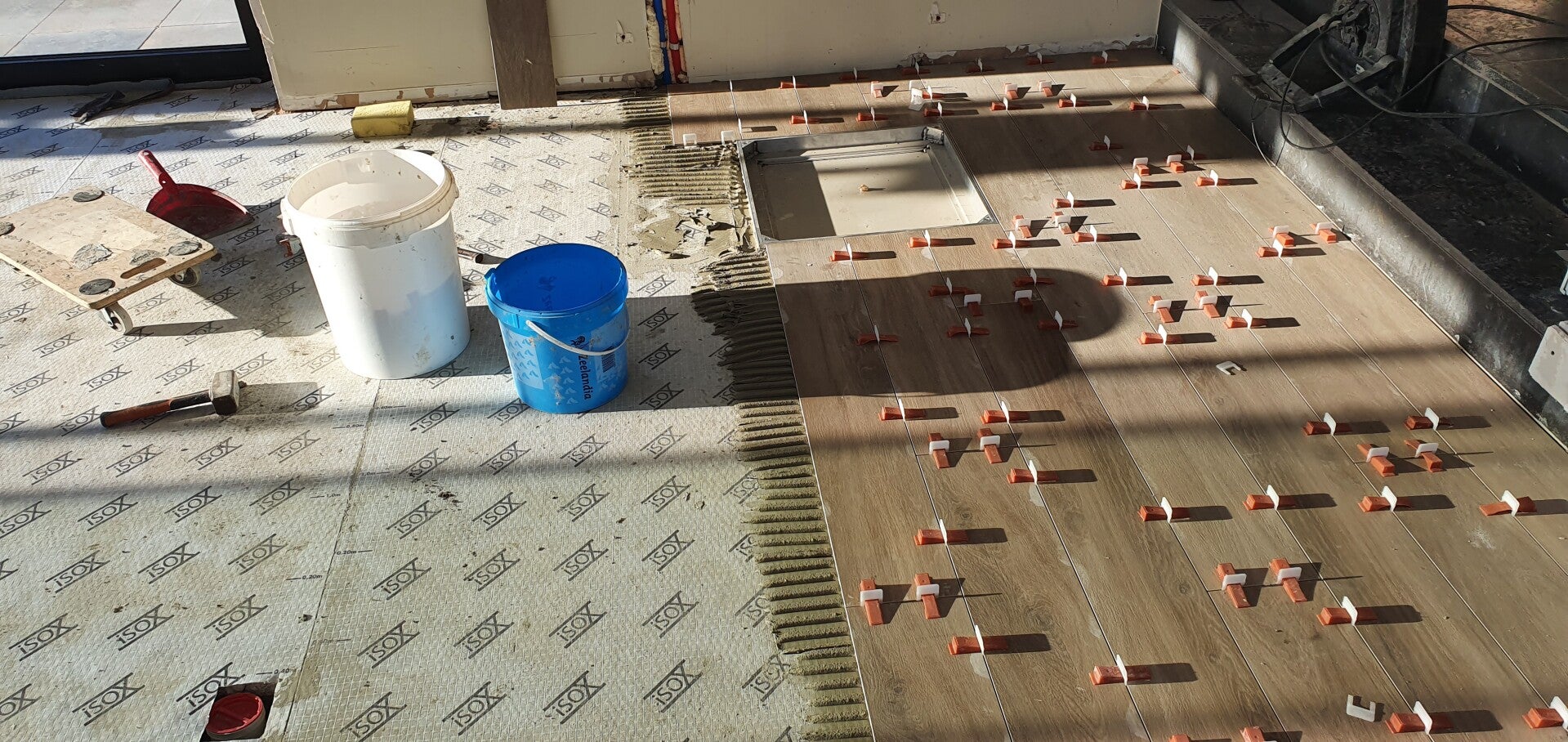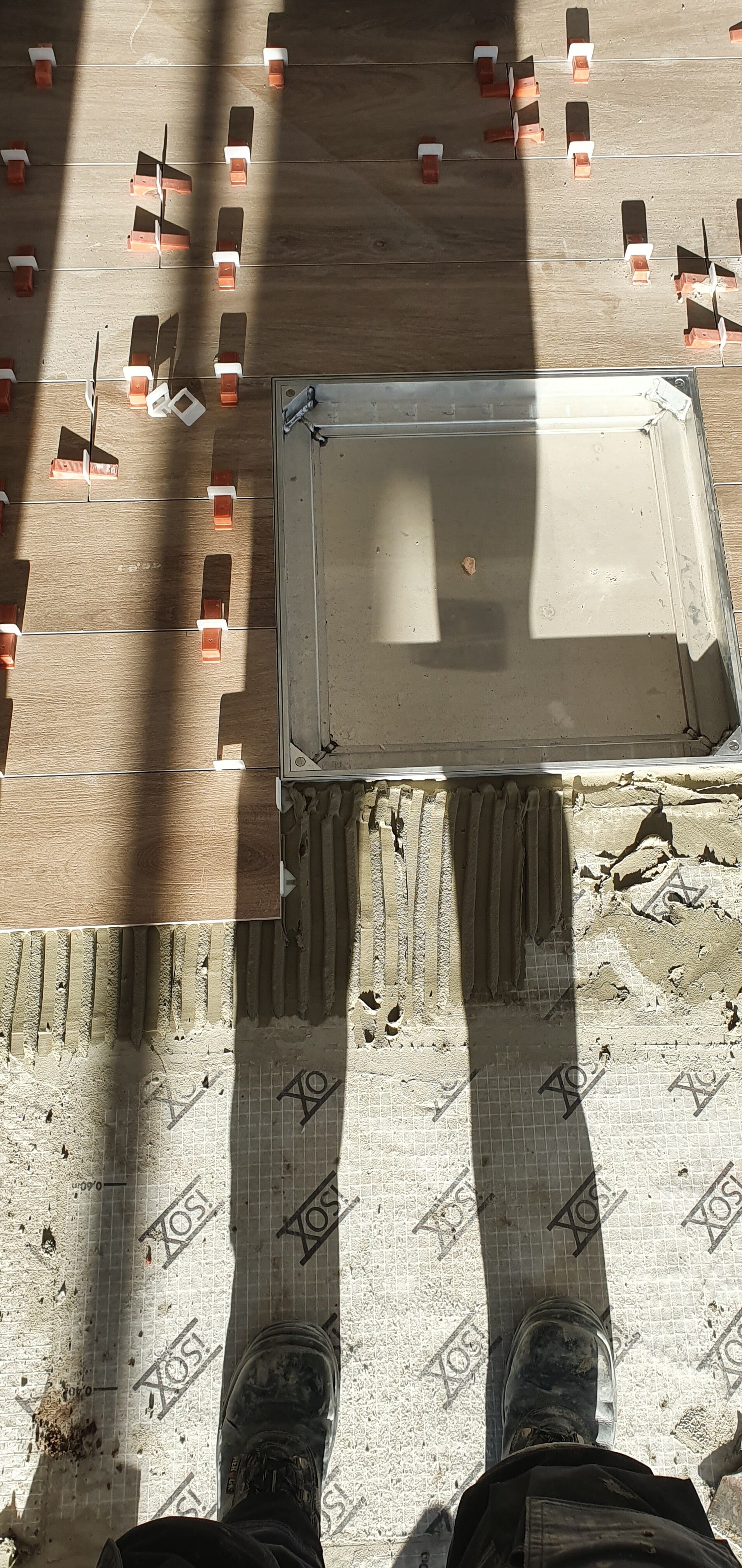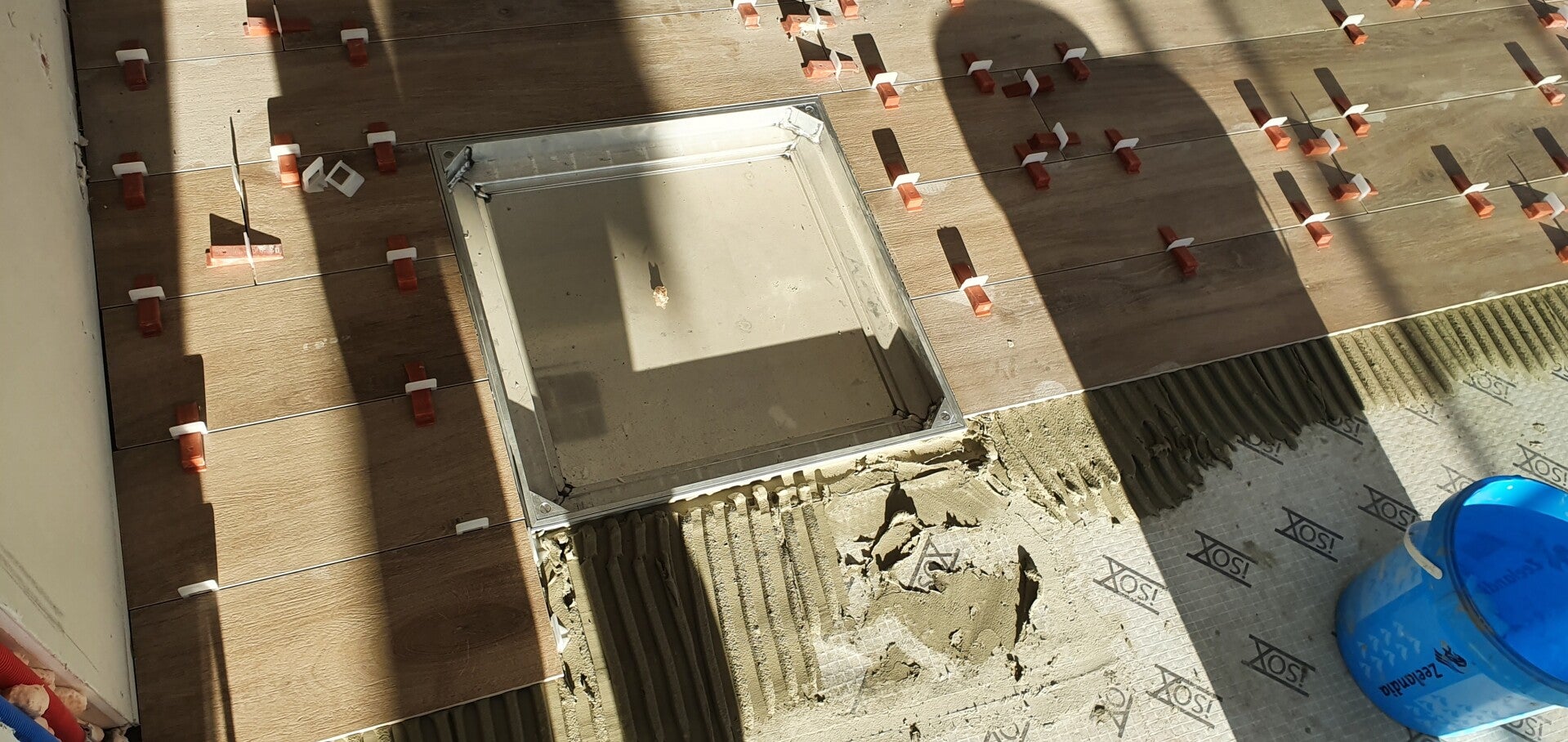 Ontkoppelingsmat met keramische parket imitatie tegels.