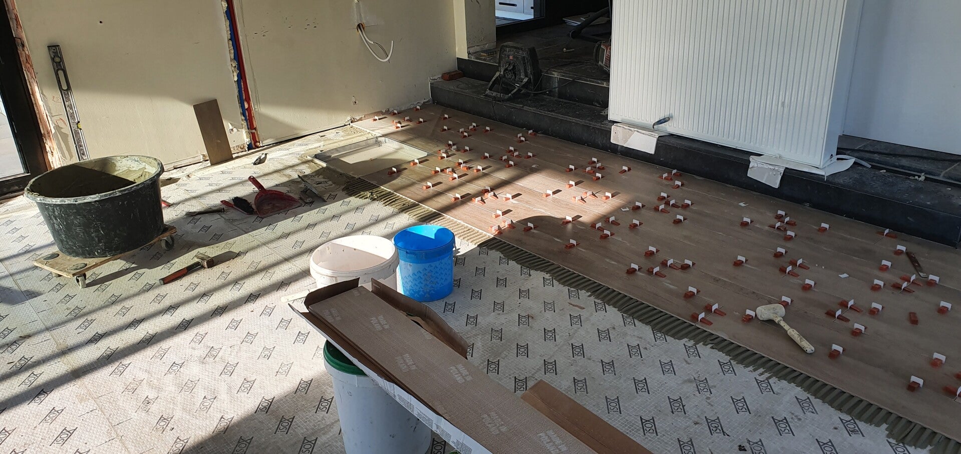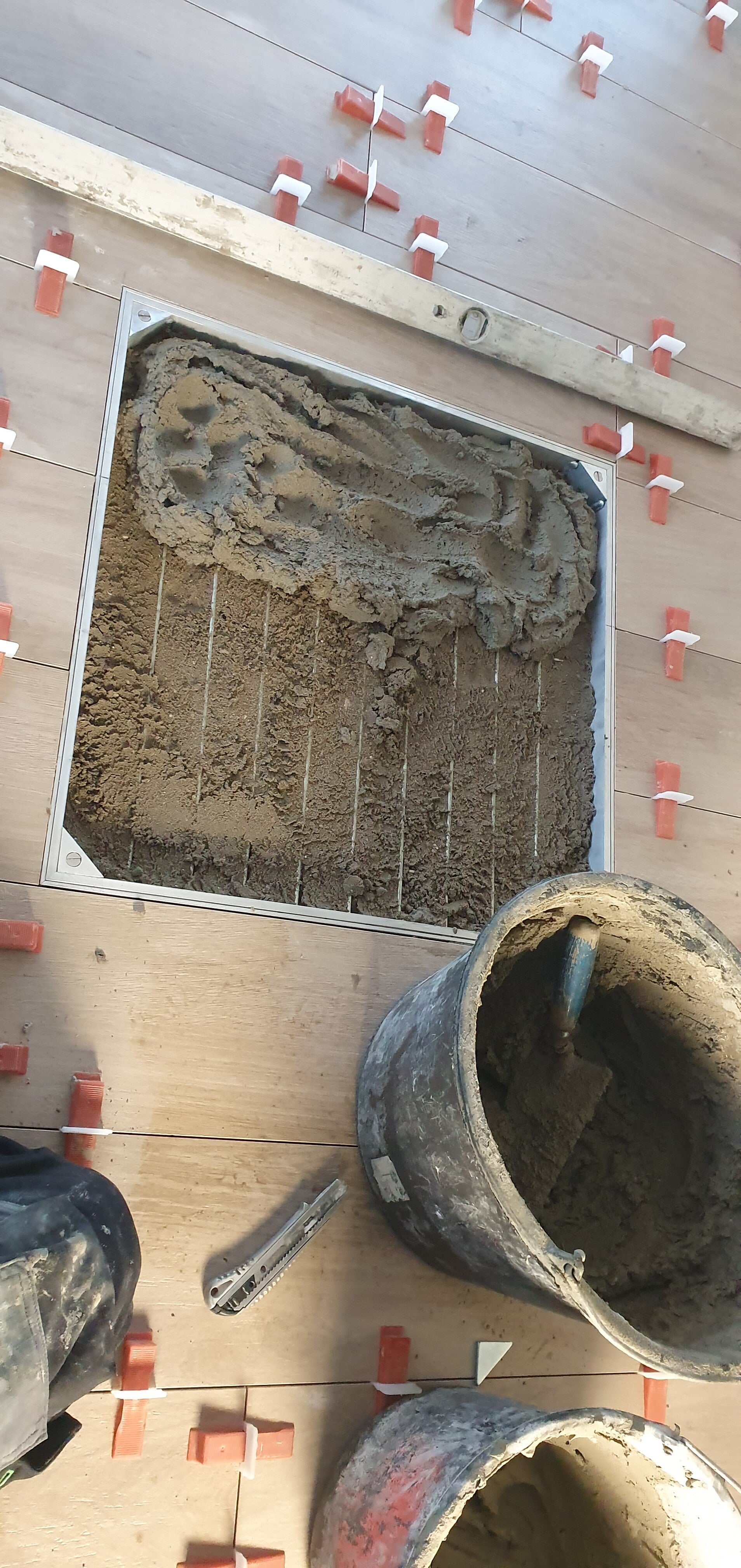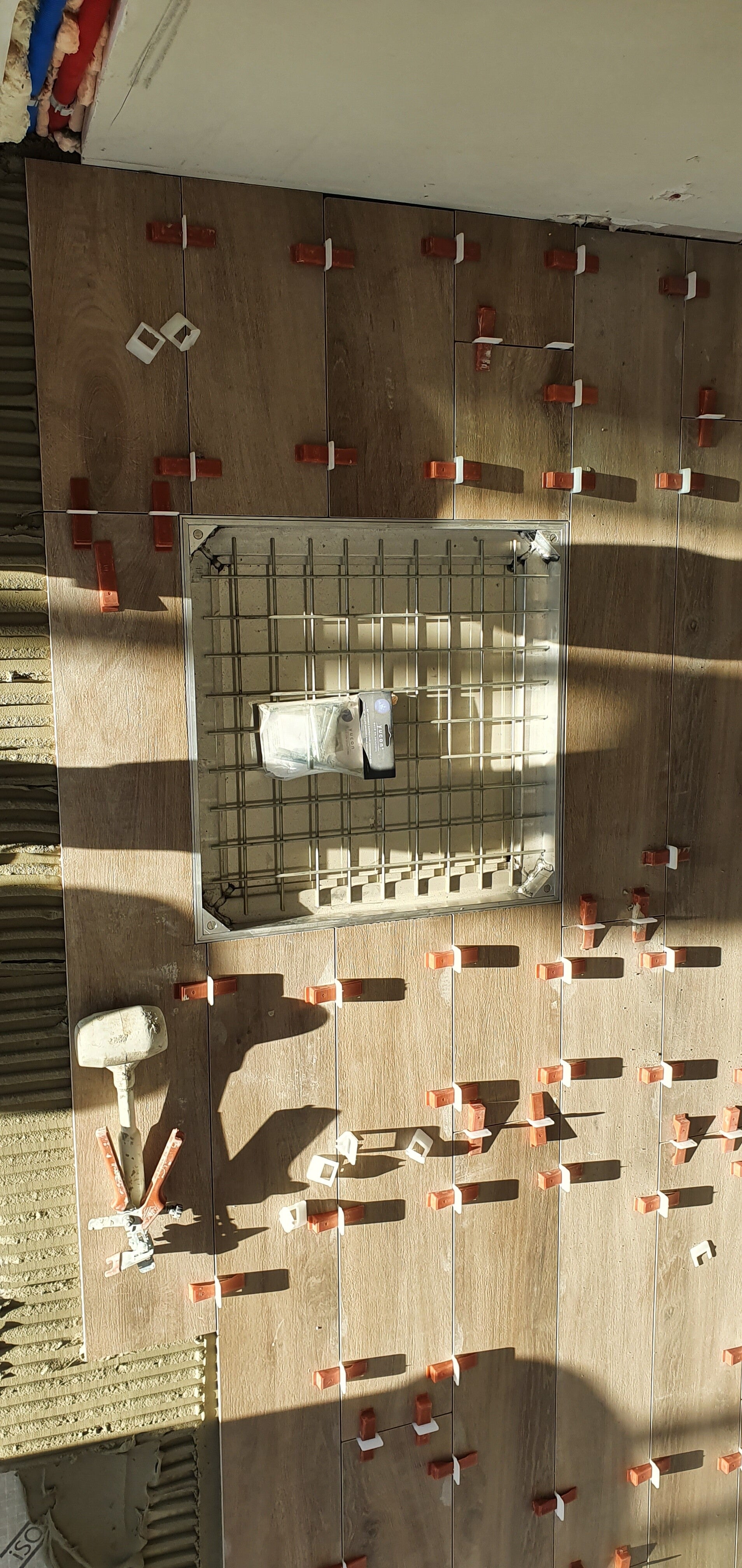 Ontkoppelingsmat met keramische parket imitatie tegels.